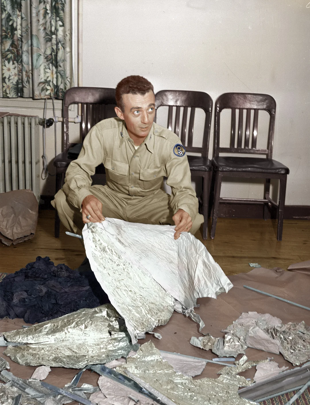 O major Jesse Marcel com destroços de um balão meteorológico. Marcel sempre negou que foi isso que ele tinha visto, pegado e entregue para seus superiores. Esta foi a primeira explicação para o caso.